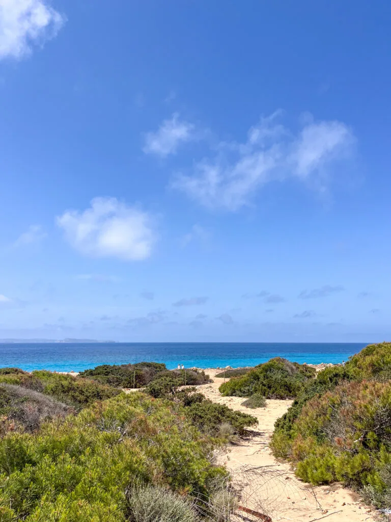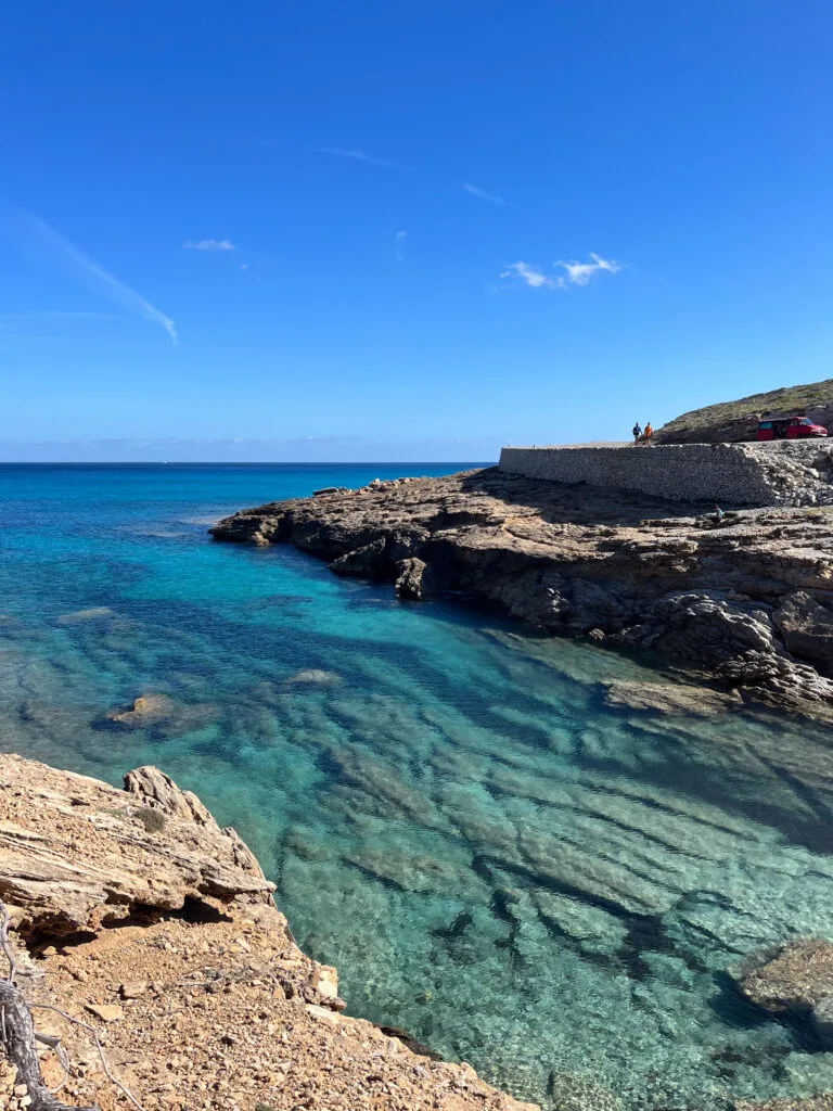 This idyllic cala is roughly a three-mile walk from the Cap de Ses Salines. At the lighthouse, facing out to the sea, turn left. There is a trail that is easy to get off of because of the nature of walking across rocks, but as long as you’re on the coast, you can’t get lost, even if you’re constantly distracted by the gorgeous views of the coast. Be prepared with plenty of water and sunscreen because it is about an hour-and-a-half walk in the sun. Wear sturdy shoes because the path is mostly rocky and uneven.