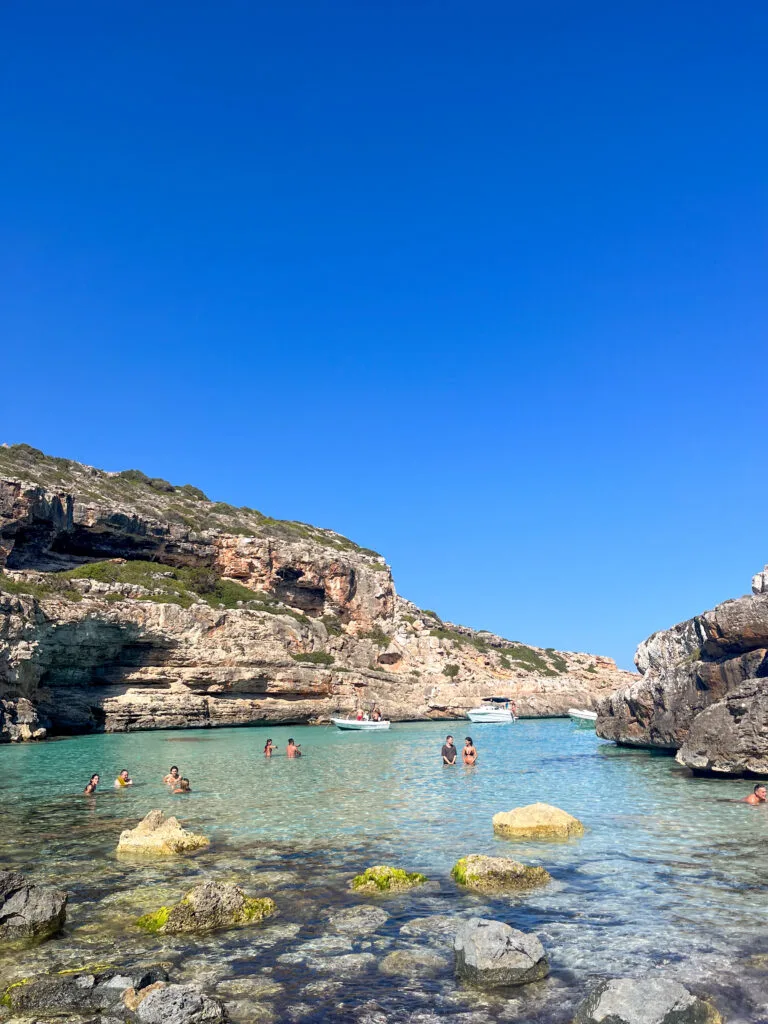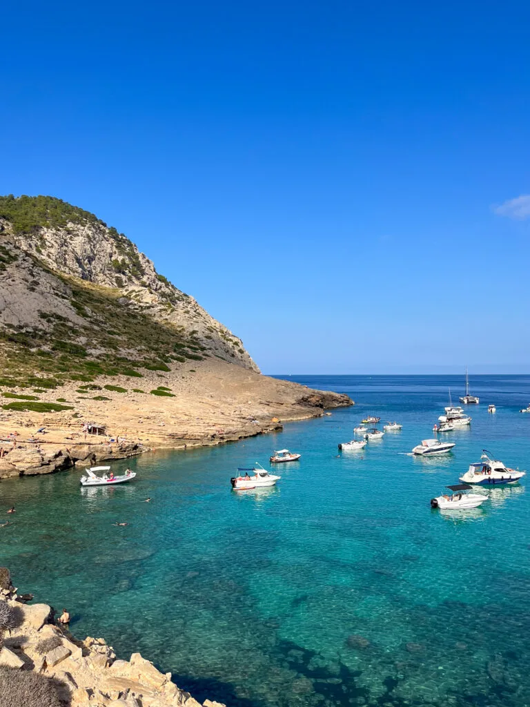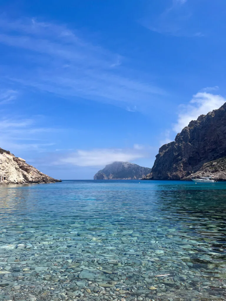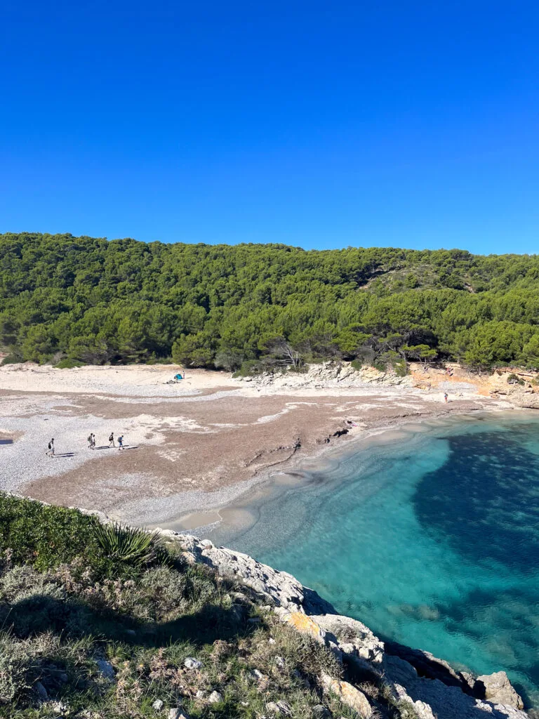 This quiet pebble beach is tucked away at the edge of the Bóquer Valley (Vall de Bóquer) in the Serra de Tramuntana mountains. It’s about a mile and a half hike. I love it because of how green it is, at least for Mallorca. You’re walking through bits of the Serra de Tramuntana and lots of low-lying shrubs and grasses. It’s not a coastal hike, more like a gentle mountain hike with a gorgeous cove at the end. The cove doesn’t have soft sand, but there are rocks you can sun on. It’s great for snorkelling. Unfortunately, I was unable to swim when I went because of the large amount of jellyfish that day, a gamble no matter which beach you go to. Nevertheless, the views and vibes were amazing all the same. A fun game to play with yourself, your friends, or your family is “Find the Goats,” because there can be a lot of them and sometimes you just hear them bleating but don’t see them. Also, protect your lunch because they can be bold.